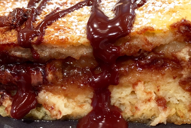 Αυγοφέτες γεμιστές με σοκολάτα και καραμελωμένες μπανάνες στο ταψί