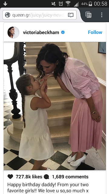 Η σχεδιάστρια μόδας πόζαρε με νάζι και μπρίο μαζί με την μικρή Harper και έστειλαν η μία στην άλλη… φιλάκι. Με αυτό τον τρόπο θέλησαν να δείξουν στο σέξι David το πόσο πολύ τον αγαπούν. Κάτω μάλιστα από τη φωτογραφία υπήρχε το εξής λεκτικό: «Χρόνια Πολλά μπαμπά! Από τα δύο σου αγαπημένα κορίτσια. Σε αγαπάμε πολύ πολύ!».