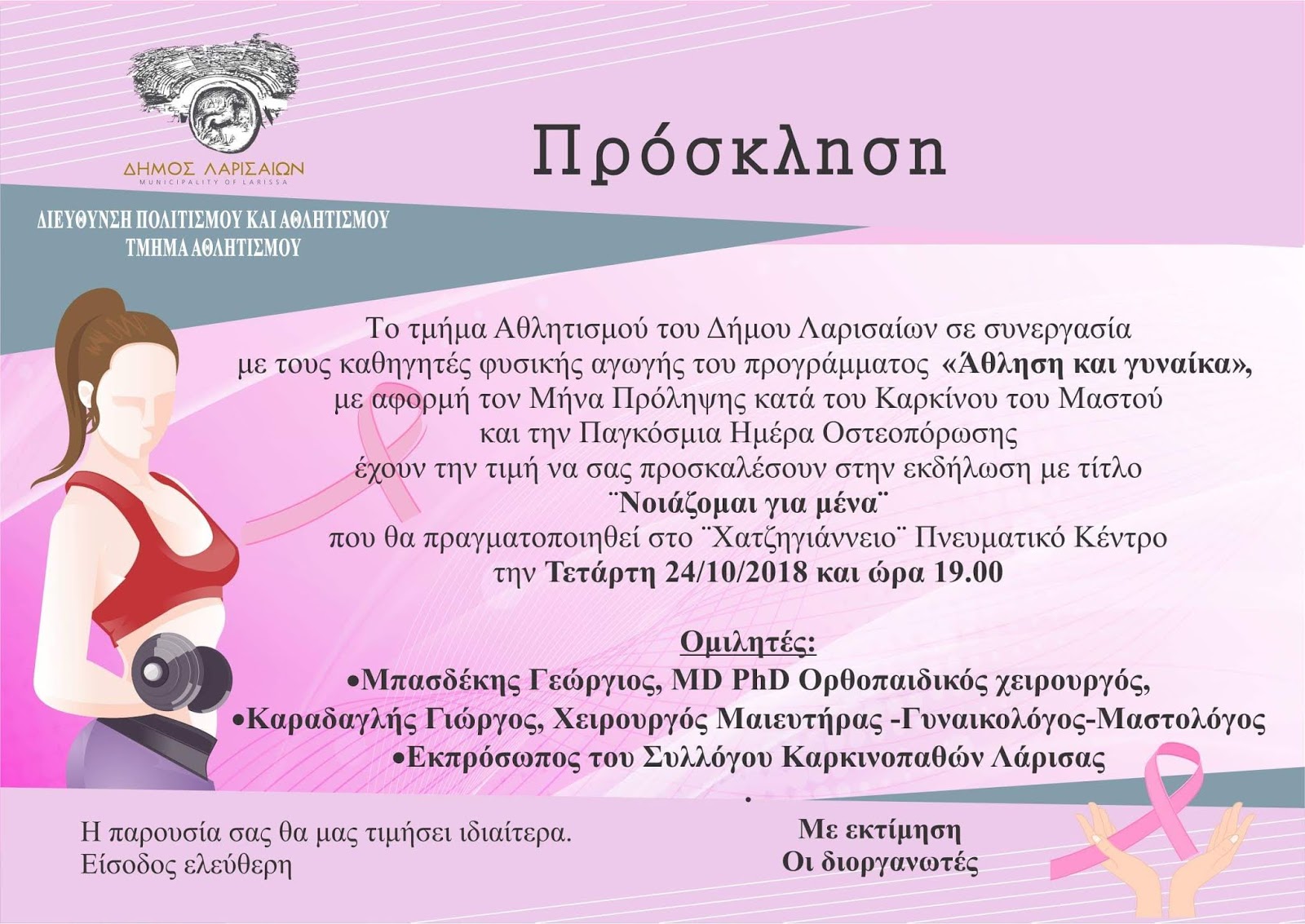 Με αφορμή τον Μήνα Πρόληψης κατά του Καρκίνου του Μαστού και την Παγκόσμια Ημέρα Οστεοπόρωσης, το τμήμα Αθλητισμού Δήμου Λαρισαίων σε συνεργασία με τους καθηγητές φυσικής αγωγής του προγράμματος ¨Άθληση και Γυναίκα¨ διοργανώνει την Τετάρτη 24 Οκτωβρίου και ώρα 19.00 στο ¨Χατζηγιάννειο¨ Πνευματικό κέντρο, εκδήλωση για τις γυναίκες με τίτλο ¨Νοιάζομαι για μένα.