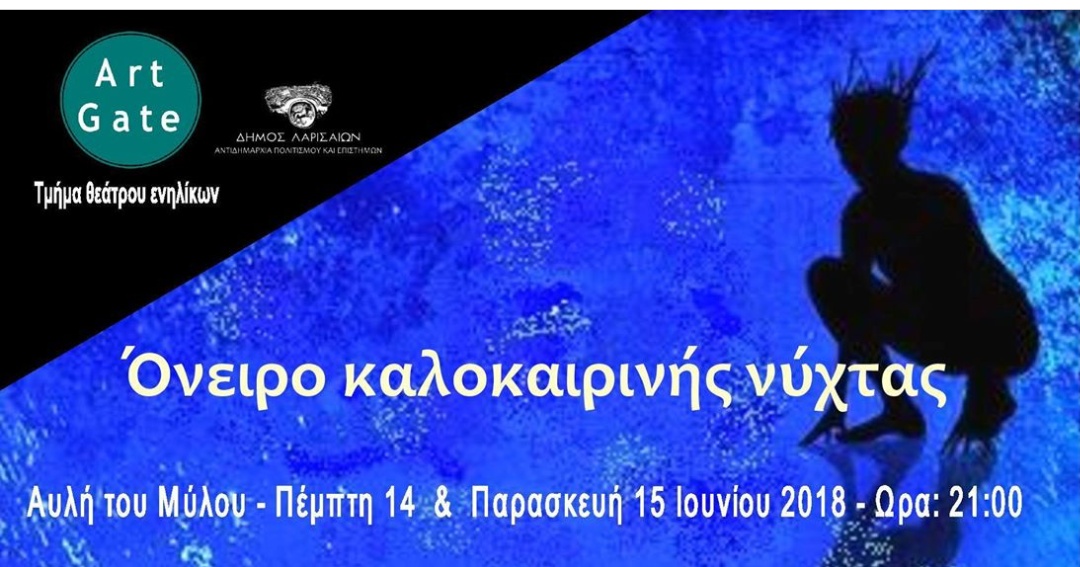 Το τμήμα Θεάτρου ενηλίκων του καλλιτεχνικού σωματείου Art Gate παρουσιάζει την κωμωδία του William Shakespeare “Ονειρο καλοκαιρινής νύχτας”, την Πέμπτη 14 & Παρασκευή, 15 Ιουνίου ώρα 21:00 στην Αυλή του Μύλου.