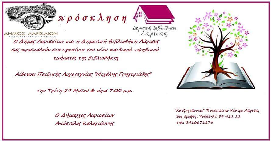 Την Τρίτη 29 Μαΐου 2018 και ώρα 7.00 μ.μ. εγκαινιάζεται το νέο παιδικό- εφηβικό τμήμα της Δημοτικής Βιβλιοθήκης Λάρισας, από τον Δήμαρχο Λαρισαίων κ. Απόστολο Καλογιάννη. Κατά τη διάρκεια της εκδήλωσης των εγκαινίων θα βραβευτούν οι φορείς και οι Λαρισαίοι συγγραφείς της παιδικής και εφηβικής λογοτεχνίας, με τους οποίους συνεργάζεται η Δημοτική Βιβλιοθήκη όλα τα χρόνια της λειτουργίας της.