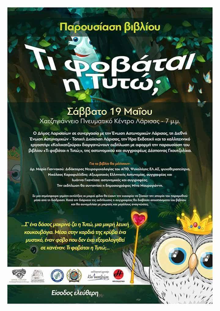 Ο Δήμος Λαρισαίων σε συνεργασία με την Ένωση Αστυνομικών Λάρισας, τη Διεθνή Ένωση Αστυνομικών – Τοπική Διοίκηση Λάρισας, την Ήρα Εκδοτική και το καλλιτεχνικό εργαστήρι «Καλικατζούρα» διοργανώνουν εκδήλωση με αφορμή την παρουσίαση του παιδικού βιβλίου «Τι φοβάται η Τυτώ;» της αστυνομικού και συγγραφέως Δέσποινας Γκουτζολίκα.