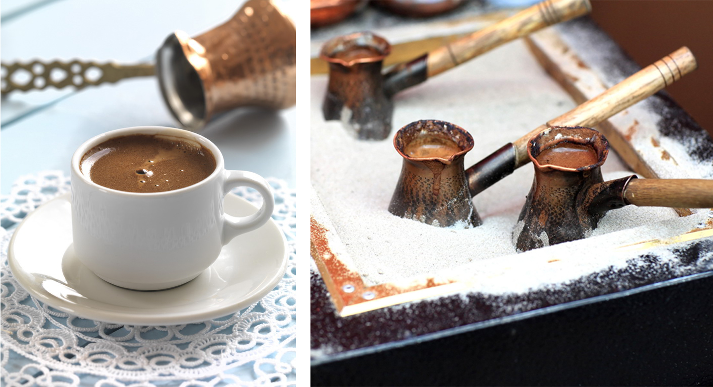 Η παρασκευή του καφέ χωρίς φιλτράρισμα, προέρχεται σχεδόν σίγουρα από τον αραβικό κόσμο. Στην Ελλάδα διαδόθηκε κατά τη διάρκεια της Οθωμανικής περιόδου. Σύμφωνα με την παράδοση οι πρώτοι που παρασκεύασαν τέτοιου είδους καφέ ήταν οι Βεδουίνοι της Μέσης Ανατολής οι οποίοι έβαζαν την χύτρα του καφέ πάνω σε άμμο που κάλυπτε στάχτη και κάρβουνα για να τα κρατήσει ζωντανά. Γι’ αυτό υπάρχει και η παράδοση να ψήνεται ο καφές πάνω σε άμμο (στη χόβολη) στα παραδοσιακά καφενεία. Η χρήση του καφέ εισήχθη στην Οθωμανική Αυτοκρατορία επί Σουλεϊμάν του Μεγαλοπρεπούς μετά την κατάκτηση της Αιγύπτου (1517). Δεν είναι ακριβώς γνωστή η εποχή που διαδόθηκε στην Κωνσταντινούπολη, υποστηρίζεται ότι η ευρύτερη χρήση του στην Πόλη έγινε με το άνοιγμα δύο καφεκοπτείων το 1554 και του πρώτου καφενείου το 1640.