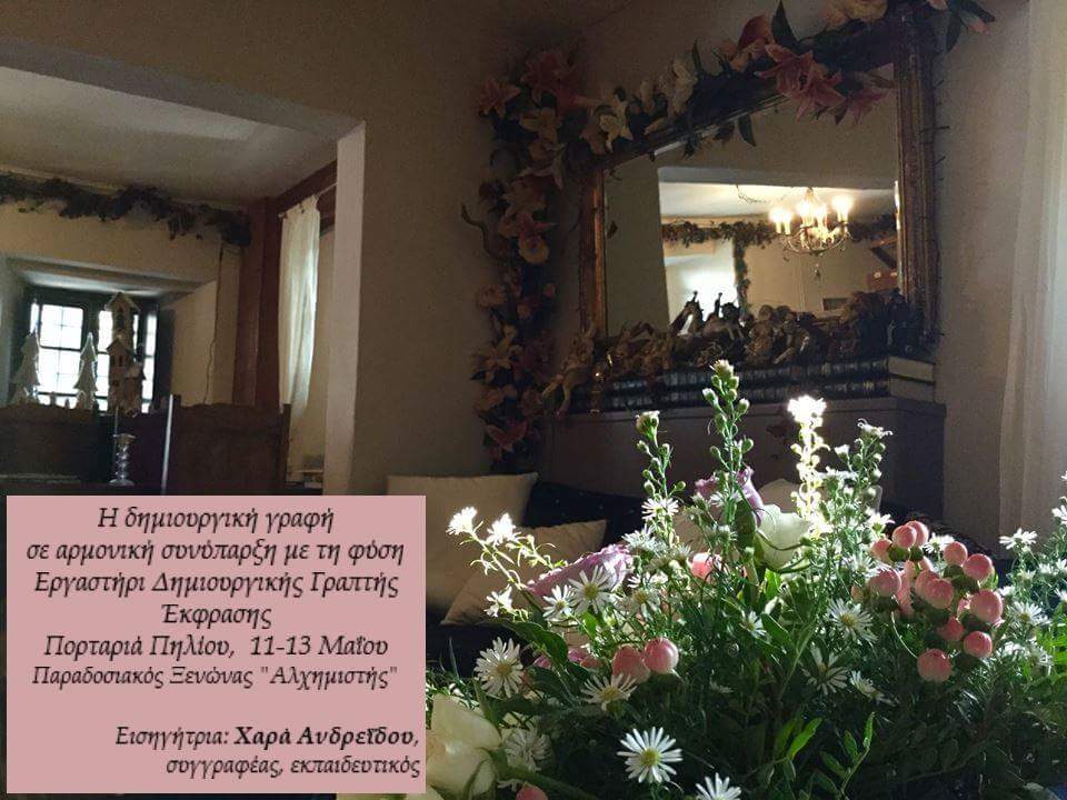 Τριήμερο Εργαστήρι Δημιουργικής Γραπτής Έκφρασης στο ανοιξιάτικο Πήλιο. Το εργαστήρι θα φιλοξενηθεί στον παραδοσιακό ξενώνα «Αλχημιστής», στην Πορταριά του Πηλίου, μέσα στον ολάνθιστο κήπο του ξενώνα. Θα ξεκινήσει την Παρασκευή 11 Μαΐου, στις 6 το απόγευμα, και θα τελειώσει την Κυριακή 13 Μαΐου, στη 1 το μεσημέρι.