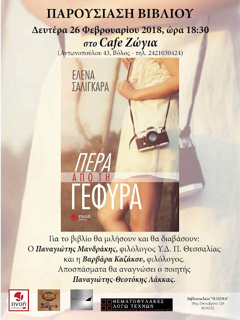Τη Δευτέρα 26 Φεβρουαρίου 2018 και ώρα 18.30, οι εκδόσεις Πνοή σε συνεργασία με το βιβλιοπωλείο «Η πένα» θα παρουσιάσουν στο Café Ζώγια το βιβλίο της Έλενας Σαλιγκάρα με τίτλο «Πέρα από τη γέφυρα».