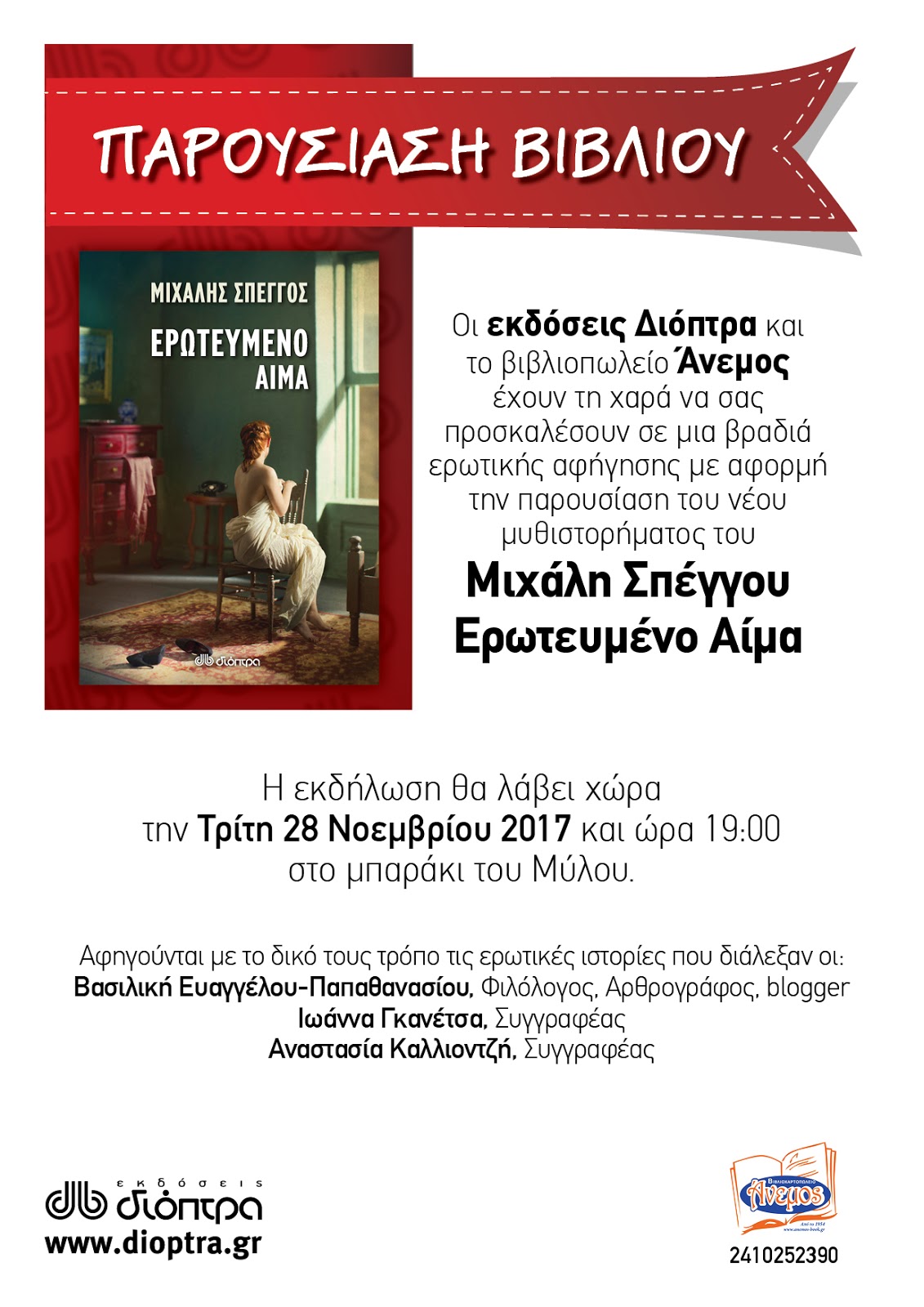 Παρουσίαση βιβλίου του Μιχάλη Σπεγγου: Ερωτευμένο Αίμα by Ντέμη Ρούσσα 26 Νοεμβρίου 2017 Share: 0 Facebook 0 Twitter 0 Pinterest Την Τρίτη 28 Νοεμβρίου 2017 ,7 μμ στο μπαράκι του Μύλου παρουσιαζεται το βιβλίο του Μιχάλη Σπεγγου “Ερωτευμένο αίμα “ 0 Facebook 0 Twitter 0 Pinterest Previous post Next post Ντέμη Ρούσσα administrator Leave a Reply Cancel replyΗ ηλ. διεύθυνση σας δεν δημοσιεύεται. Τα υποχρεωτικά πεδία σημειώνονται με * Αποθήκευσε το όνομά μου, email, και τον ιστότοπο μου σε αυτόν τον πλοηγό για την επόμενη φορά που θα σχολιάσω.