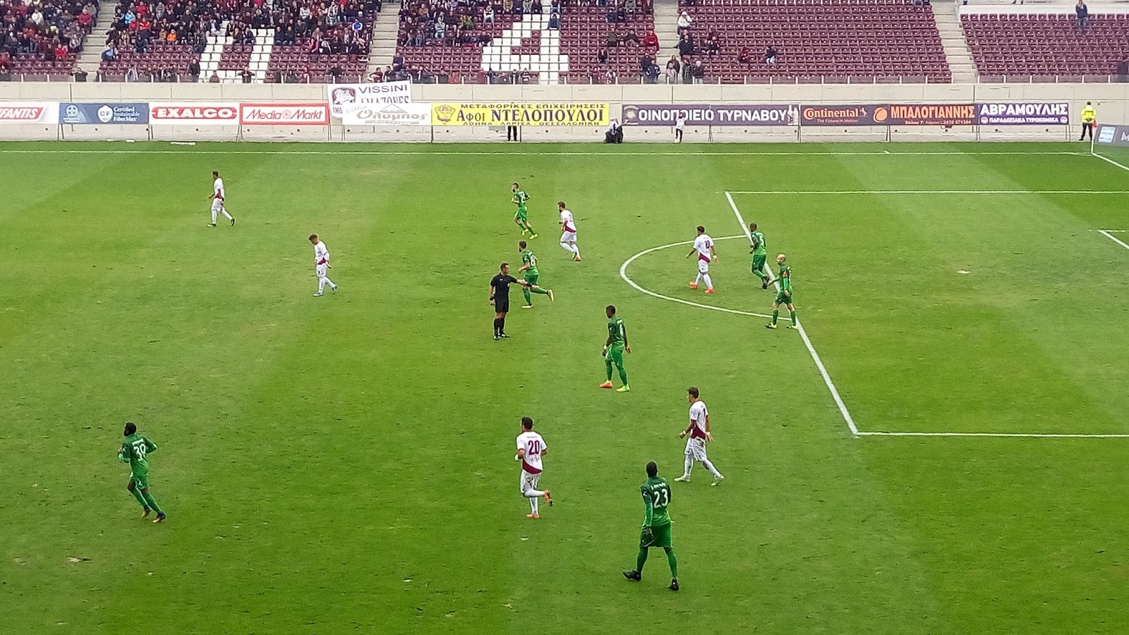 Φάουλ για την ΑΕΛ με το Γουάλας η μπάλα στα σώματα των παικτών του Λεβαδειακού στο 28 λεπτό