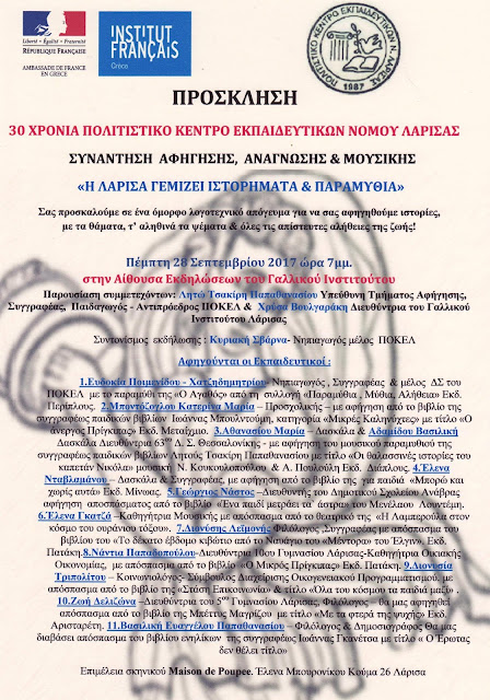 ΠΟΚΕΛ.Η Λάρισα γεμίζει ιστορήματα και παραμύθια by Ντέμη Ρούσσα 20 Σεπτεμβρίου 2017 Share: 0 Facebook 0 Twitter 0 Pinterest 28 Σεπτέμβρη ώρα 7μμ στο Γαλλικό Ινστιτούτο “Η Λάρισα γεμίζει Ιστορήματα & Παραμύθια”!!! για τα 30 Χρόνια του ΠΟΚΕΛ 0 Facebook 0 Twitter 0 Pinterest Previous post Next post Ντέμη Ρούσσα administrator Leave a Reply Cancel replyΗ ηλ. διεύθυνση σας δεν δημοσιεύεται. Τα υποχρεωτικά πεδία σημειώνονται με * Αποθήκευσε το όνομά μου, email, και τον ιστότοπο μου σε αυτόν τον πλοηγό για την επόμενη φορά που θα σχολιάσω.