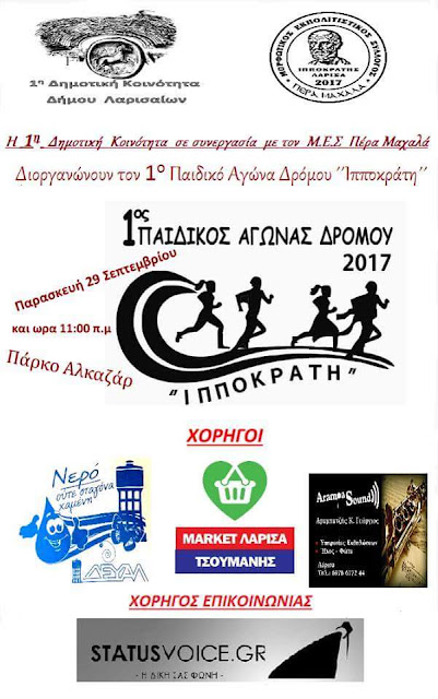 Στοχεύοντας να αναδείξει του μνημείο του Ίπποκράτη και του πάρκο Αλκαζάρ, η 1η Δημοτική Κοινότητα του Δήμου Λαρισαίων σε συνεργασία με τον ΜΕΣ Πέρα Μαχαλά διοργανώνουν τον 1ο Παιδικό Αγώνα Δρόμου «ΙΠΠΟΚΡΑΤΗ», με τη συμμετοχή των μαθητών των Δημοτικών Σχολείων της περιοχής 14ο, 27ο και 31ου