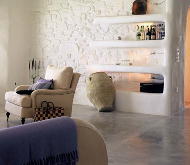 Στα κυκλαδίτικα σπίτια το λευκό διακοσμέιται πάνω σε λευκό σε ένα συνεχές layering λευκών επιφανειών.