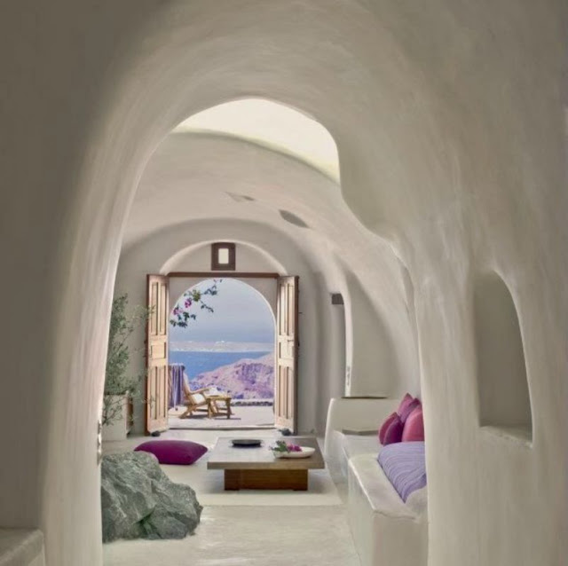 Τα σπίτια και τα ξενοδοχεία μοιάζουν να βρίσκονται χτισμένα σε σπηλιές με το λευκό χρώμα να κυριαρχεί παντού και όχι μόνο στους τοίχους. Συγκεκριμένα υπάρχει ένα layering λευκών επιφανειών και επίπλων που είναι όλα στημένα χωρίς απόλυτη αρχιτεκτονική ακρίβεια.