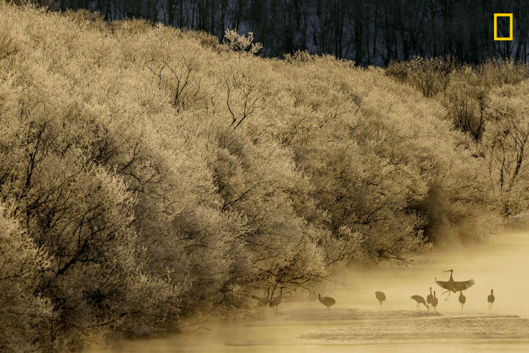 «Οι σιλουέτες των γερανών μέσα στην πρωινή ομίχλη». Φωτογράφος: Hiroki Inoue