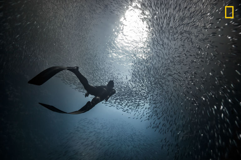 «Ελεύθερη κατάδυση στη σπηλιά των χελιδονιών στη Τόνγκα. Η συγκεκριμένη σπηλιά είναι «σπίτι» χιλιάδων ψαριών τα οποία… χορεύουν συντονισμένα κάθε φορά που κάποιος κατεβαίνει στο βυθό. Η αντίθεση του σκοταδιού του πυθμένα με το φως της επιφάνειας κάνει τα ψάρια να μοιάζουν με αστέρια, λάμψεις στον ουρανό». Φωτογράφος: Marc Henauer