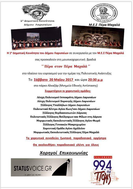 Η 1η Δημοτική Κοινότητα του Δήμου Λαρισαίων σε συνεργασία με τον Μ.Ε.Σ Πέρα Μαχαλά σας προσκαλούν στη μουσικοχορευτική Βραδιά ”Πέρα στον Πέρα Μαχαλά”.
