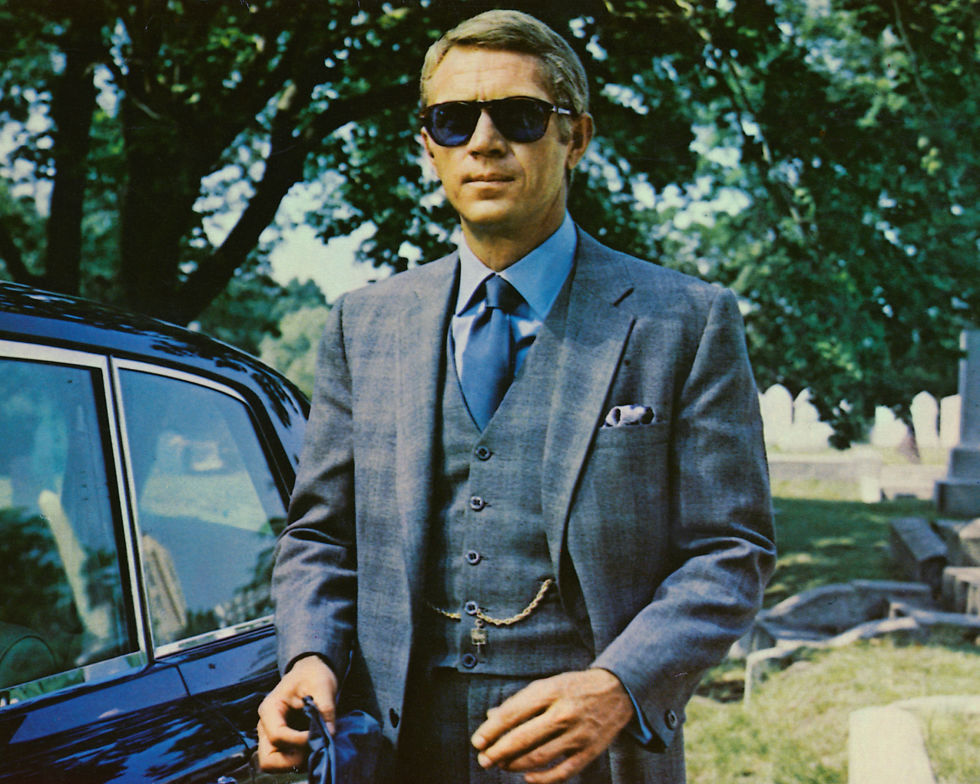 Συνδυάζοντας ένα από τα πιο κομψά κοστούμια που έχουμε δει ποτέ στη μεγάλη οθόνη –«Υπόθεση Τόμας Κράουν» 1968- με ένα από τα πιο μοντέρνα γυαλιά ηλίου της εποχής των 60s, τα οποία φέρουν σήμερα το όνομά του: Persol Steve McQueen Folding.