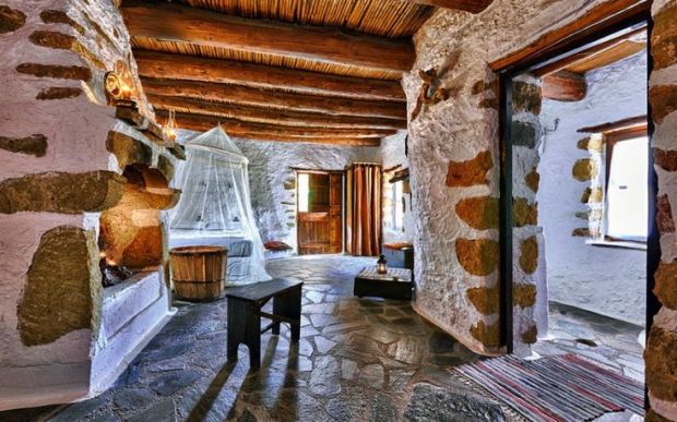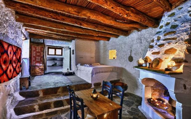 Στο εσωτερικό, οροφές με δοκάρια, βράχια που βγαίνουν από τους τοίχους, χτιστά κρεβάτια, σοφράδες, παλιές κασέλες και υφαντά συνθέτουν ένα σκηνικό που χαρίζει στους επισκέπτες μια αυθεντική εμπειρία παραδοσιακής Κρήτης.