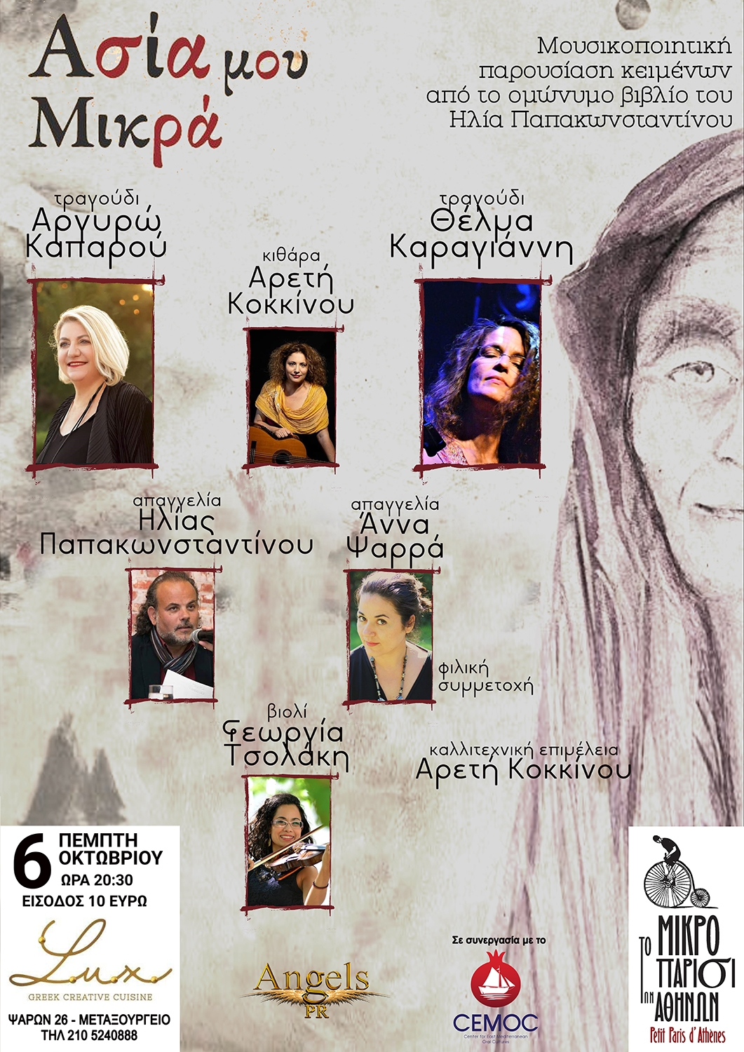 Μουσικοποιητική παράσταση βασισμένη σε κείμενα από το ομώνυμο βιβλίο του Ηλία Παπακωνσταντίνου. Το ποιητικό έργο ΑΣΙΑ ΜΟΥ ΜΙΚΡΑ αποτελείται από ποιήματα,